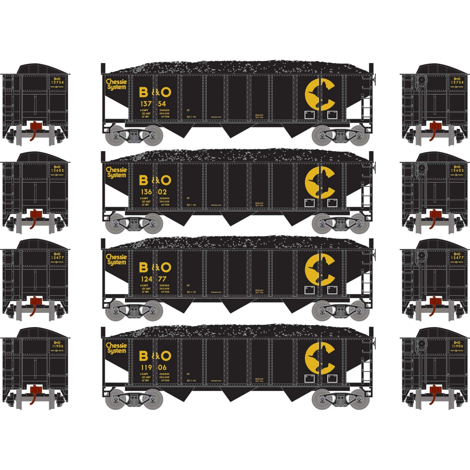 Athearn N 40′ 3-Bay Ribbed Hopper with Load, B&O #2 (4) for Freight Cars
